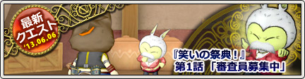 今回からスタートするクエストシリーズ「笑いの祭典!」は、プクリポの初期村「プクレットの村」の外伝クエストです。「賢者ホーローさんと会ったことがある」ことが、第1話「審査員募集中」の受注条件となっています。2013年 6月 6日~6月 20日にかけて全5話が配信されました。