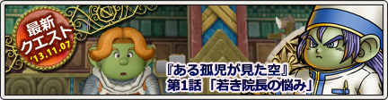 今回からスタートするクエストシリーズ「ある孤児が見た空」は、「ドルワーム王国」の外伝クエストです。メインストーリー「ドルワームのおはなし」をクリアして「金のキーエンブレム」を持っていることが、第1話「若き院長の悩み」の受注条件となっています。2013年 11月 7日~12月 2日にかけて全5話が配信されました。
